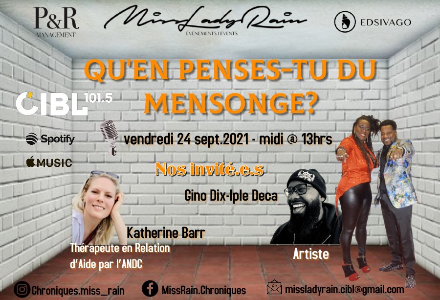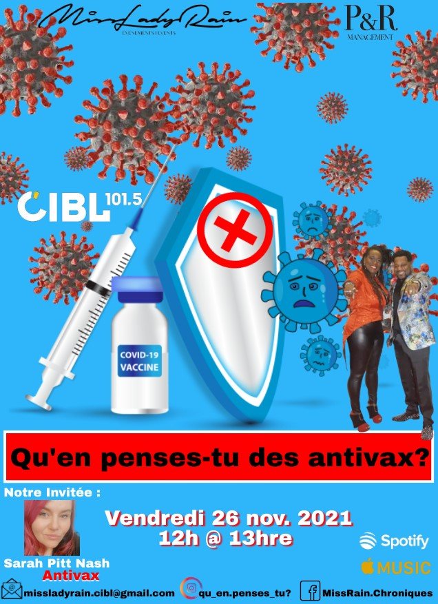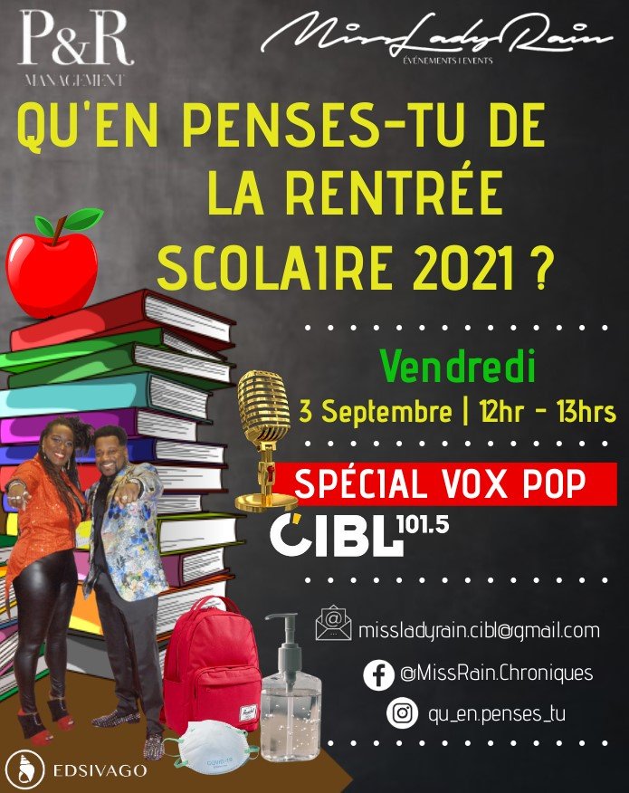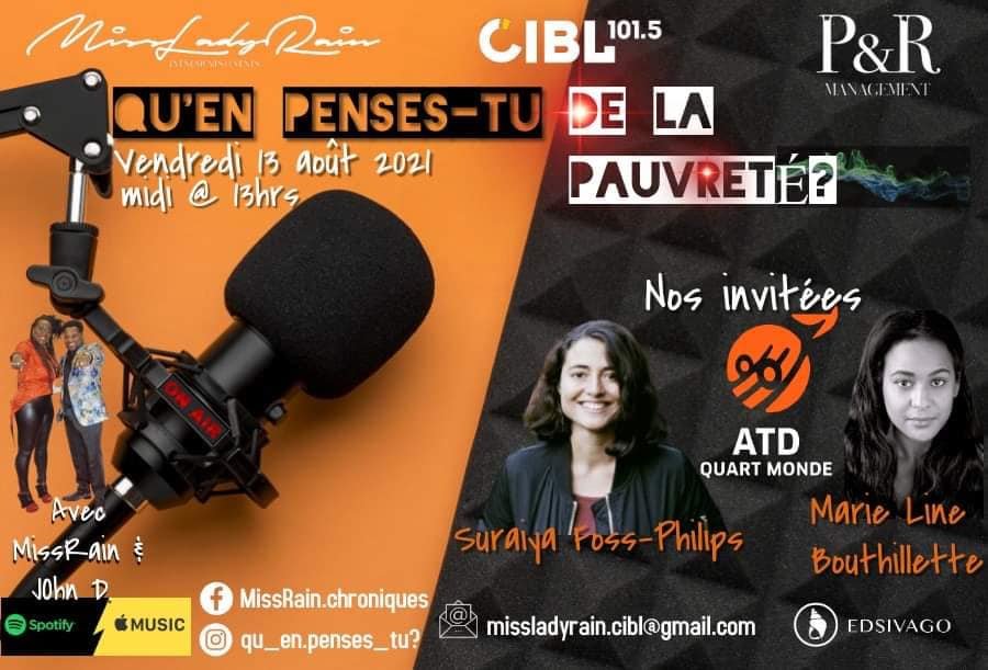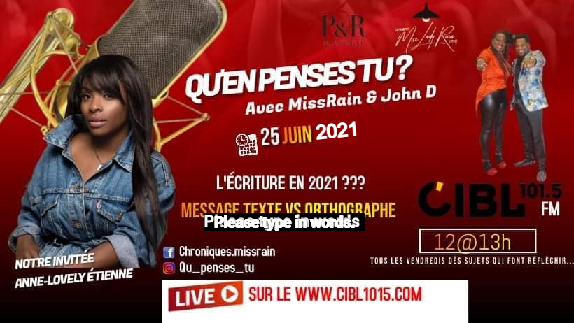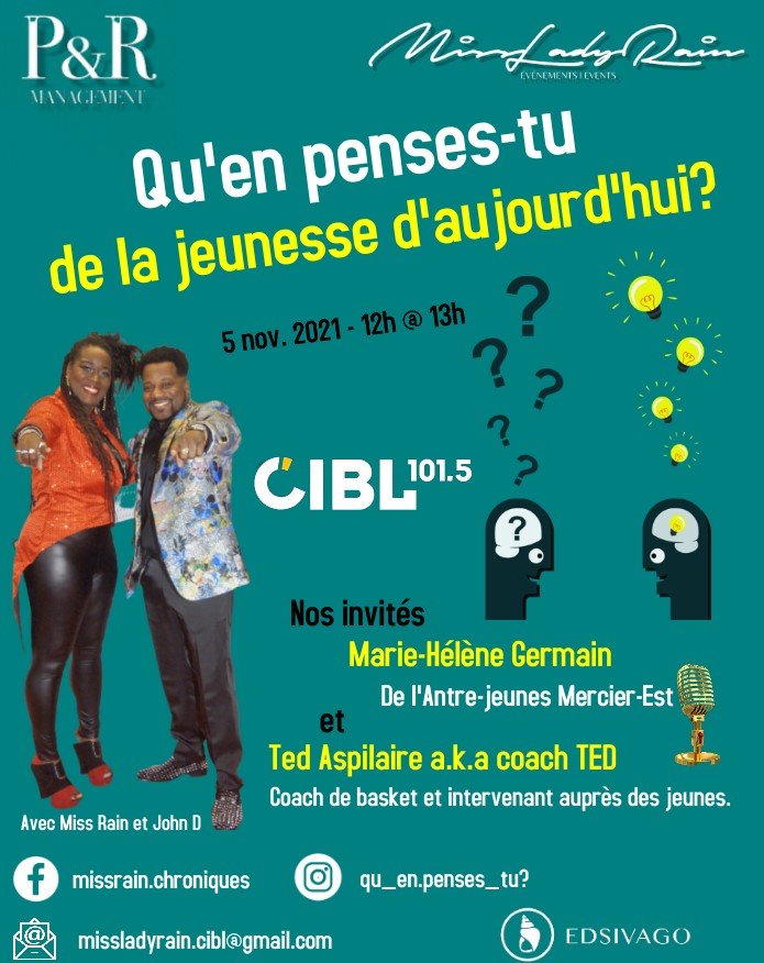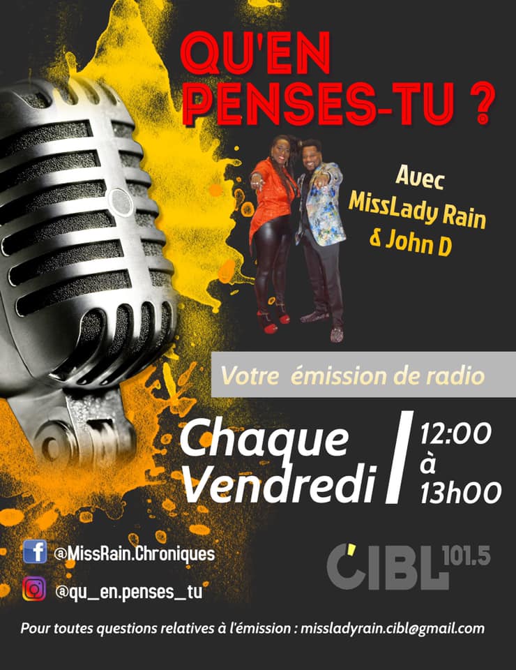 « Qu’en penses-tu avec MissRain & John D. ? » was a french local radio show of reflection and collective discussion, where we tackled societal issues with our special guests from all type of domain. Each week, through the voices of your vibrant host MissRain and her distinguished sidekick Jonh D., you’ll hear what others are thinking but not saying out loud in any society subject .